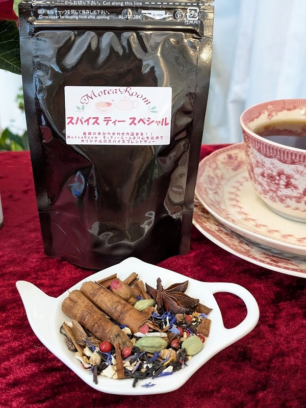 5種類の茶葉とシナモンやカルダモン、ジンジャーなどの天然スパイスをたっぷりブレンドしている MoteaRoom-モッティールームのオリジナルで自信をもってお届けできる美味しいスパイスティー。